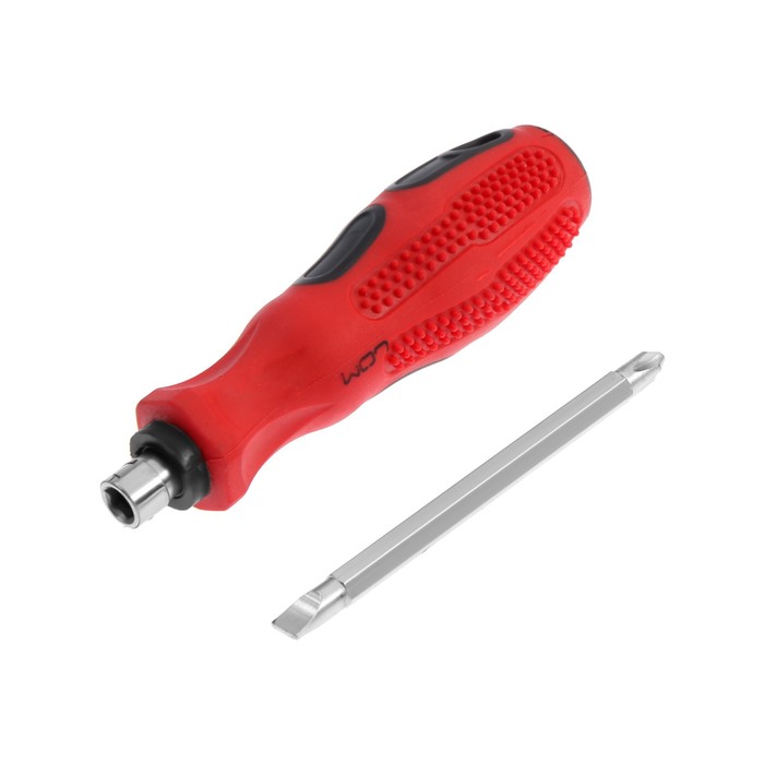 Особенность изделия в том, что это две отвёртки в одной — крестовая и шлицевая.