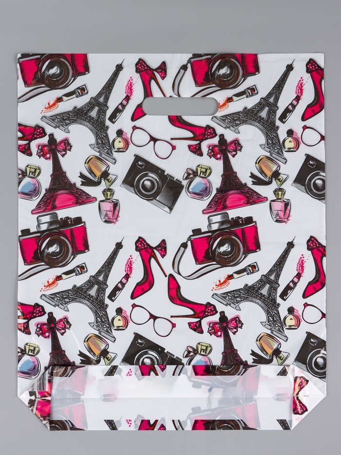 Универсальный стиль для городских подарков. Пакет с вырубной ручкой «Аксессуар», 36x43 см — это вместительная и легкая упаковка с графичным дизайном. Ее тематический принт подходит для магазинов, ориентированных на стиль и путешествия.