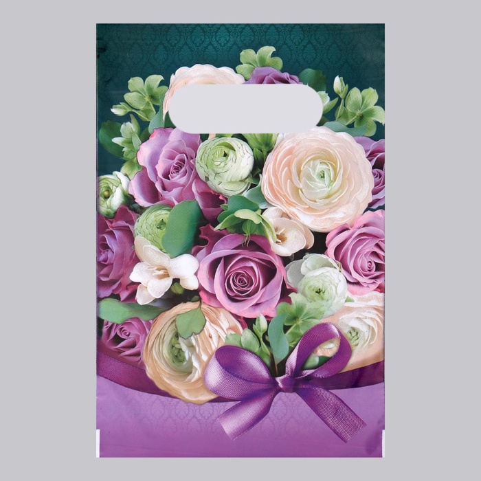 - Универсальный праздничный дизайн: Нежный сиреневый фон и классический цветочный орнамент делают пакет уместным для многих поводов. Он особенно хорошо подходит для 8 Марта, Дня рождения или в качестве знака внимания.