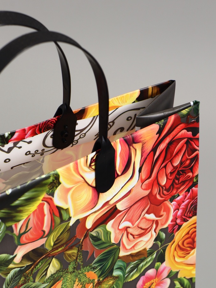 - Выбор цвета и дизайна: Жёлтый, чёрный или разноцветный вариант. На пакете — рисунки с надписями, буквами, цифрами и цветочно-растительными мотивами. Ламинация защищает изображение от влаги и придаёт аккуратный блеск.