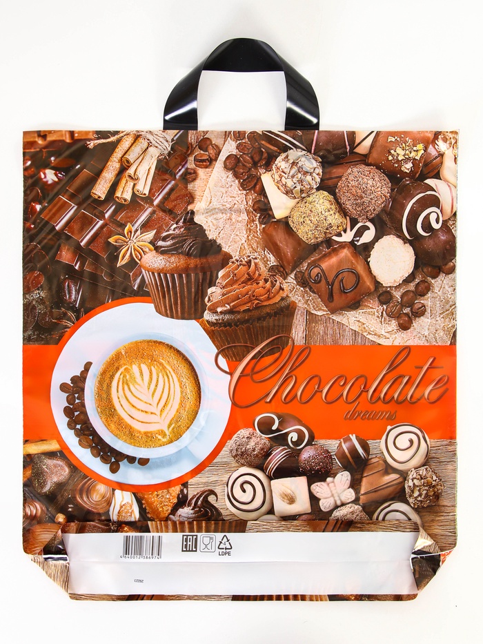 Сладкое настроение в большой сумке. Большой полиэтиленовый пакет с рисунком «Кофе и шоколад» — это прочная и аппетитная упаковка для покупок в кондитерских, кофейнях или продуктовых магазинах. Его дизайн сразу намекает на содержимое и создаёт ощущение домашнего уюта.