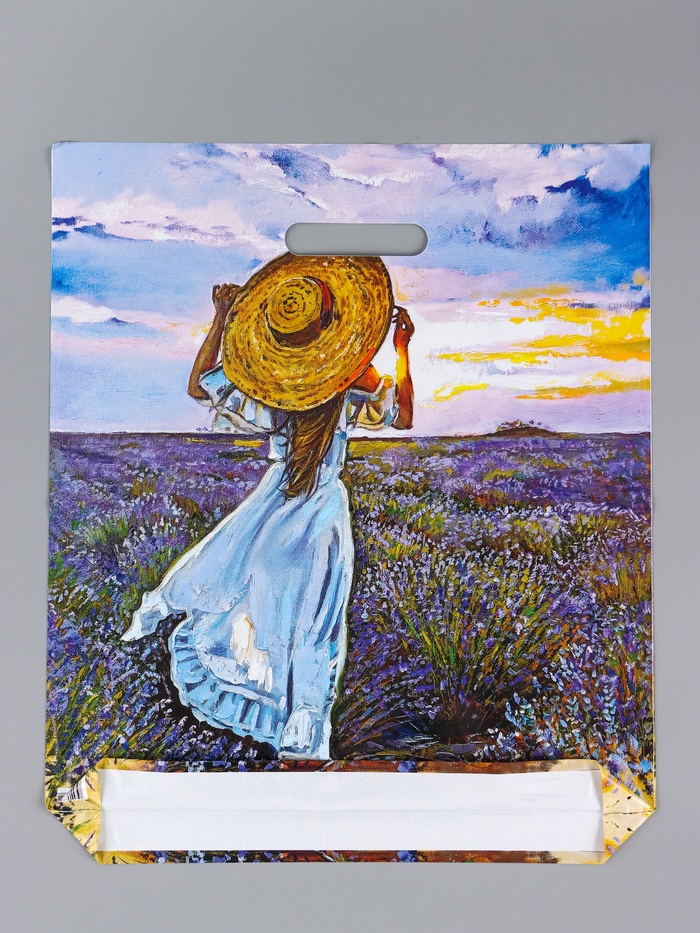 Элегантность и вместимость для особенных покупок. Пакет с вырубной ручкой «Лавандовое поле», 38x45 см — это прочная и стильная упаковка с цветочным дизайном. Ее романтичное оформление и увеличенный объем подходят для подарков и покупок, где важна эстетика.