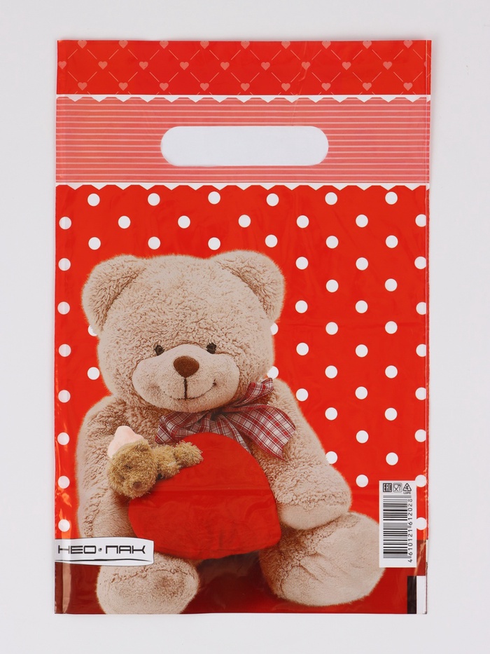 Пакет "Мишка с сердцем", полиэтиленовый с вырубной ручкой, 20х30 см, 30 мкм