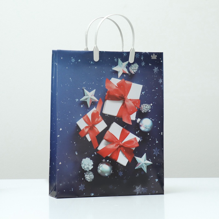 Новогодний подарочный пакет с ярким, красочным рисунком создаст праздничное настроение.