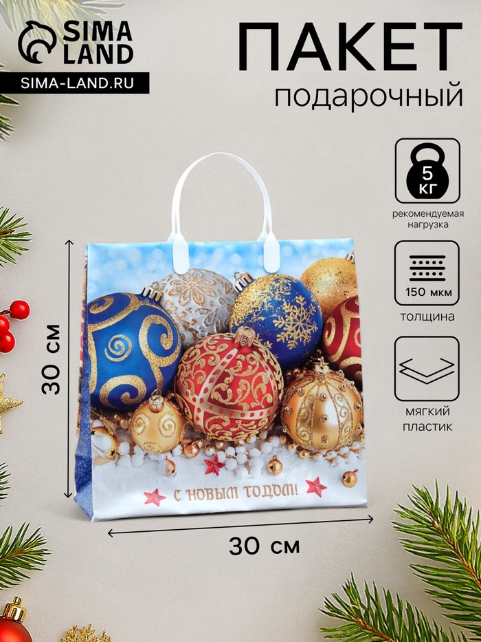Новогодний подарочный пакет с ярким, красочным рисунком создаст праздничное настроение.