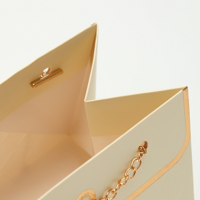 Элегантная упаковка для самых нежных букетов! Кремовый подарочный пакет с цепью — стильное решение для тех, кто ценит утонченность. Золотое тиснение на бежевом фоне создает благородный образ, превращая обычный букет в изысканный подарок.