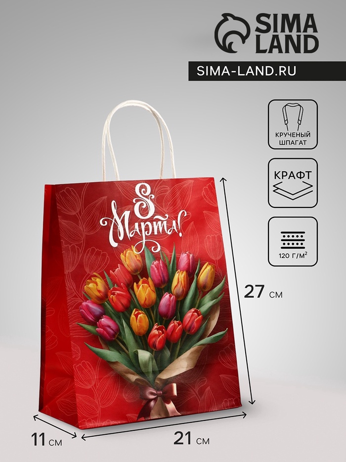 Пакет подарочный крафт, «8 Марта», 21×11×27 см