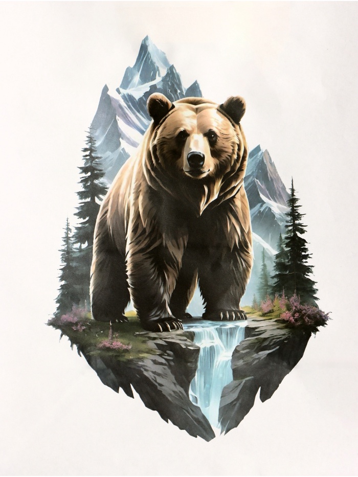 - Рисунок с изображением медведя и природными мотивами создаёт атмосферу уюта.
