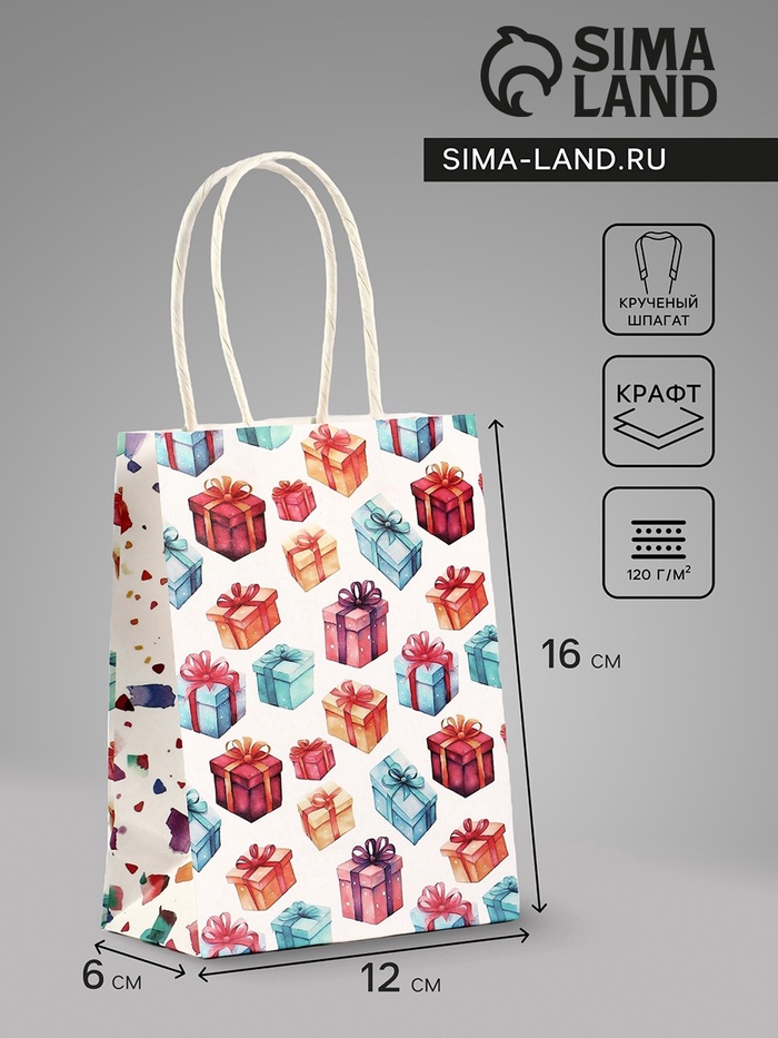 Крафт-пакет «Подарки» сочетает в себе праздничность и практичность. Его универсальный дизайн подходит для подарков на День рождения, детские праздники или другие торжества. Благодаря прочному материалу и яркому оформлению, он станет запоминающимся дополнением к вашему сюрпризу.