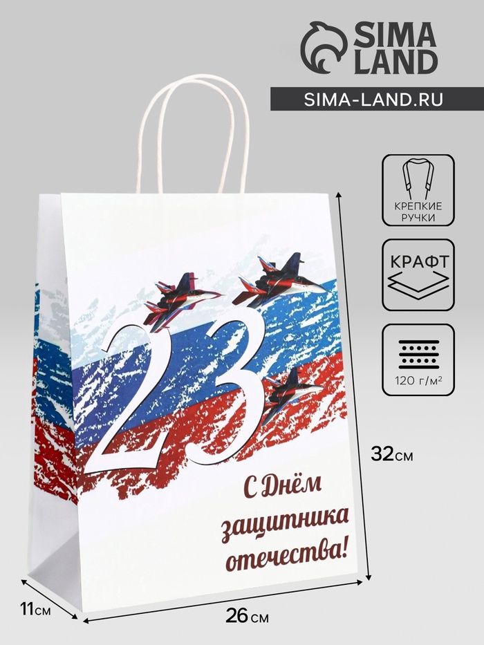 Пакет подарочный крафт «С 23 Февраля!» 26×11×32 См
