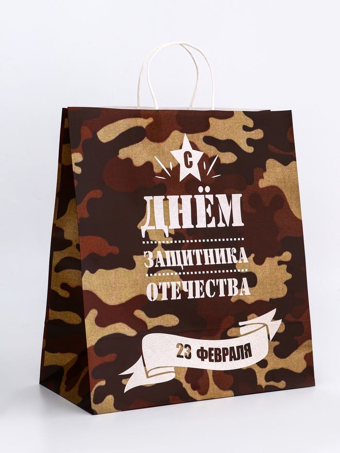 Этот крафтовый пакет с надписью "С 23 Февраля!" станет идеальным выбором для упаковки подарков на День защитника Отечества.