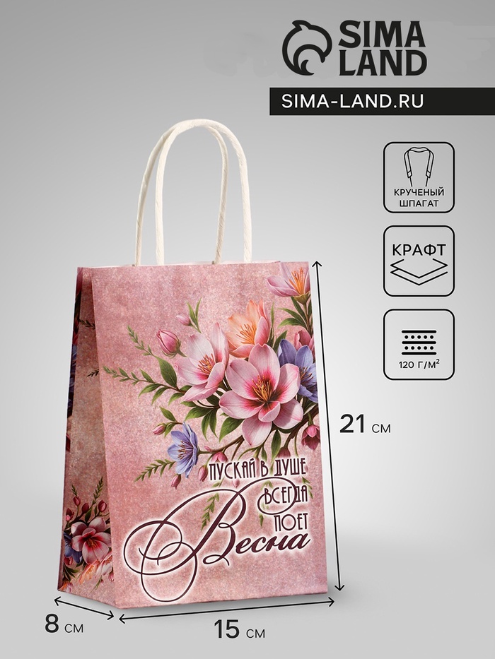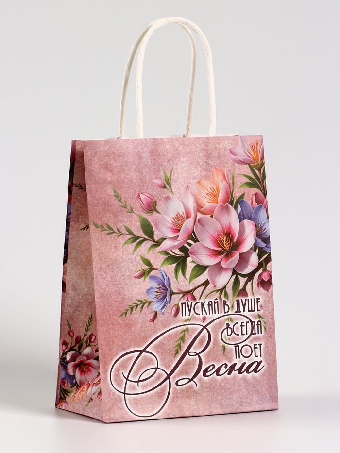 Пакет подарочный крафт, «Весна!», 15×8×21 см