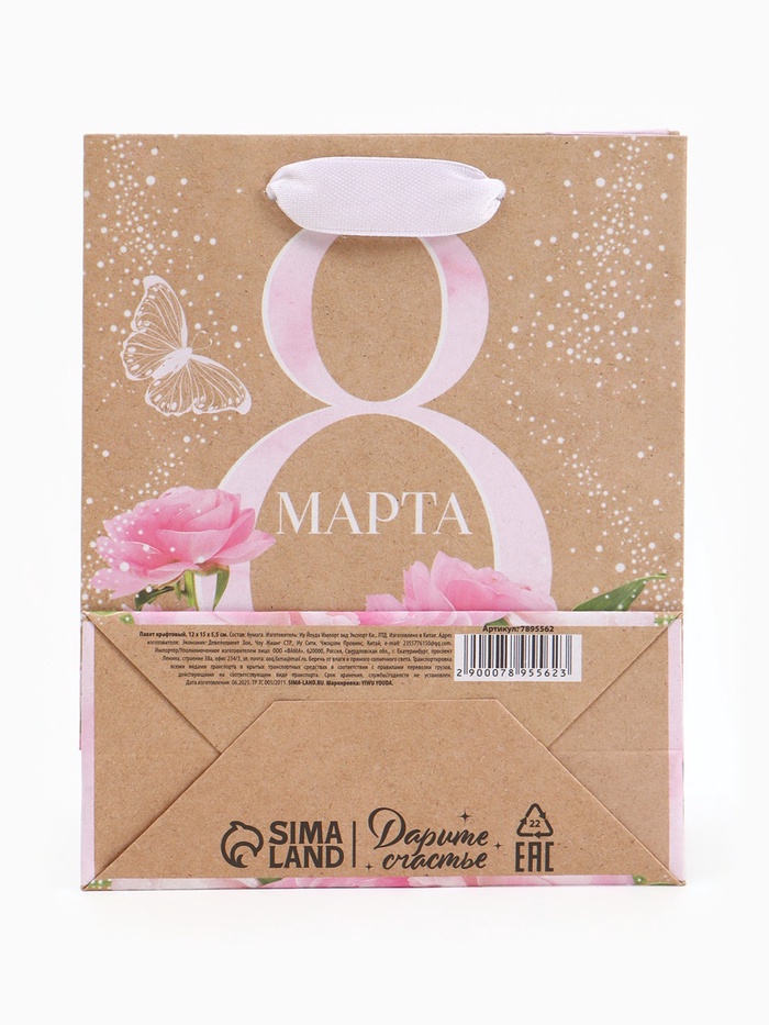 Пакет подарочный крафтовый, упаковка, «8 марта», S 12×15×5.5 см