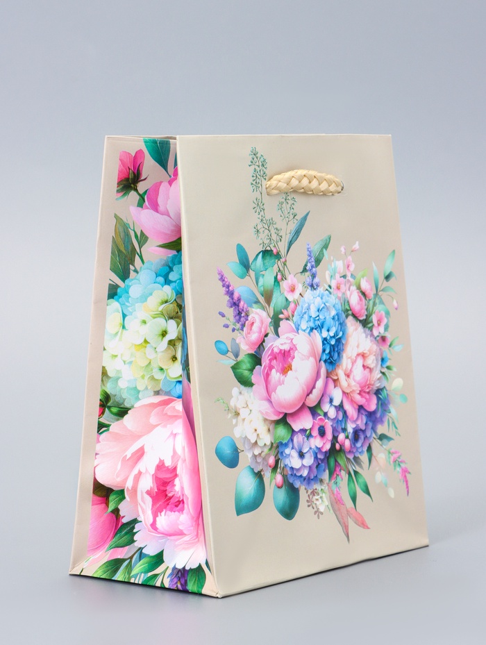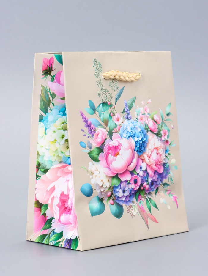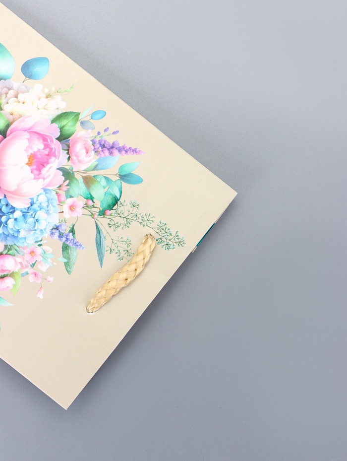 - Нежный женственный дизайн: Бежевый фон с цветочным орнаментом создает ощущение нежности и изящества. Этот пакет станет подходящим выбором для подарка девушке или женщине на 8 Марта, День рождения или 14 Февраля.