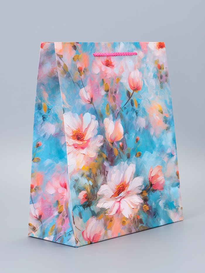 Подарочный пакет «Цветочное настроение» – это упаковка с растительным принтом в голубых тонах для подарков женщинам и девушкам. Пакет создает ощущение легкости и весенней свежести.