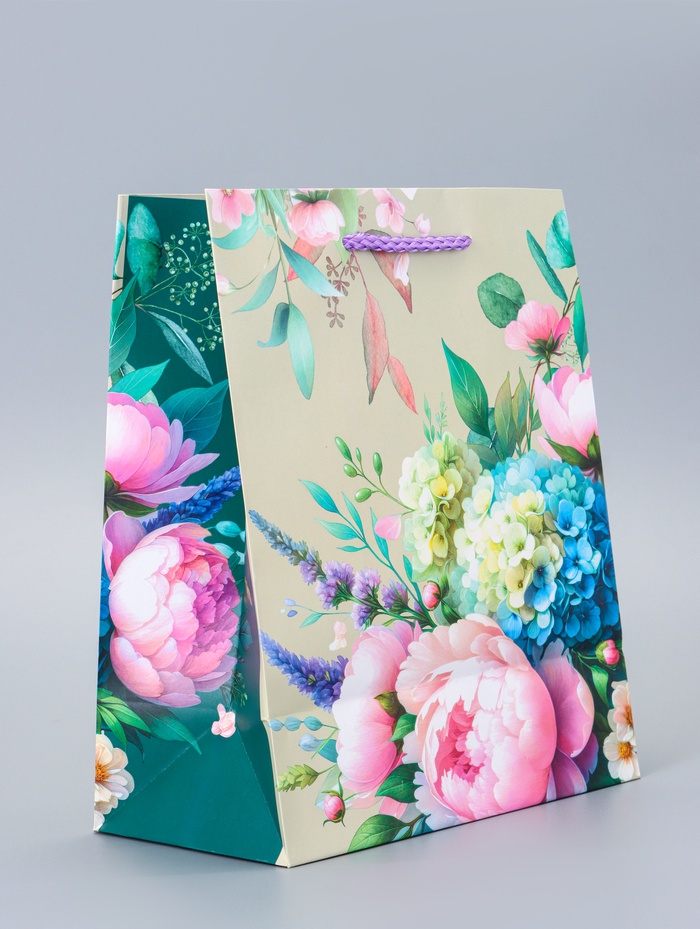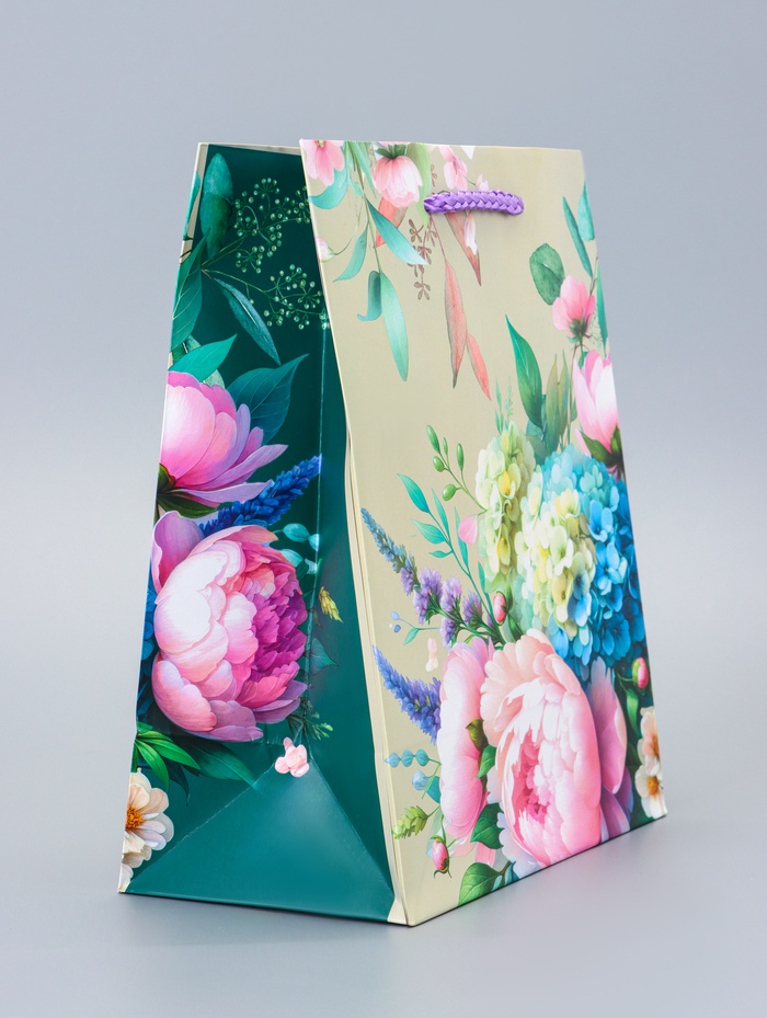 - Яркий цветочный дизайн: Зеленый фон с выразительным цветочным принтом передает ощущение энергии и позитива. Этот пакет станет удачным выбором для подарка женщине или девушке на 8 Марта, День рождения или как проявление внимания без повода.