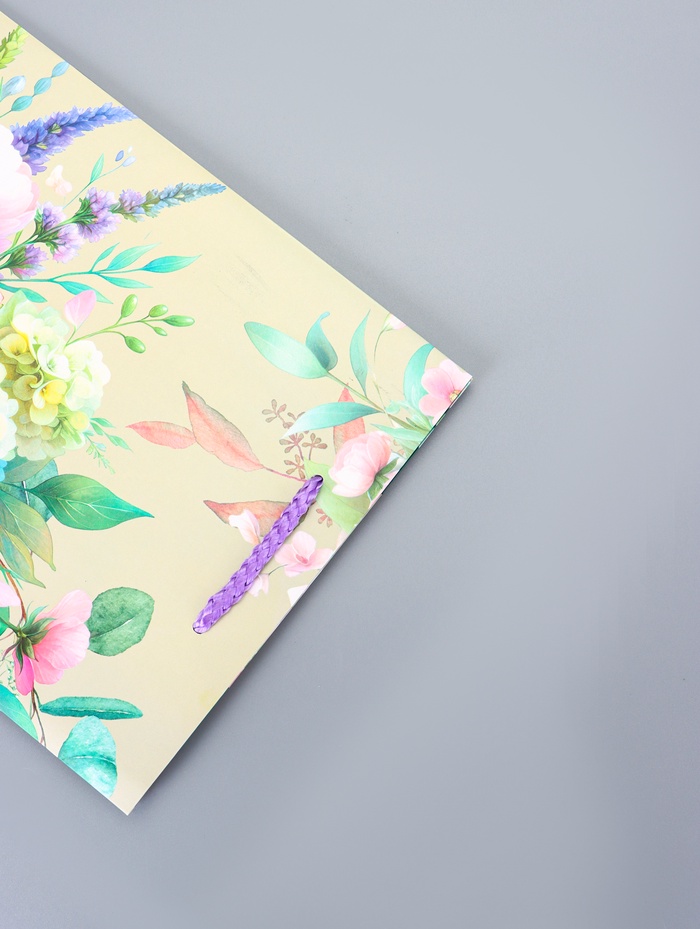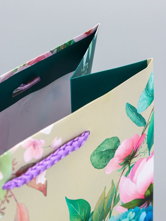 - Комфорт в использовании: Мягкая шнуровая ручка удобно лежит в руке. Боковые складки добавляют пакету дополнительный объем для размещения небольших, но ценных презентов.