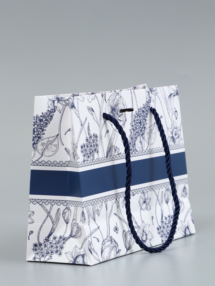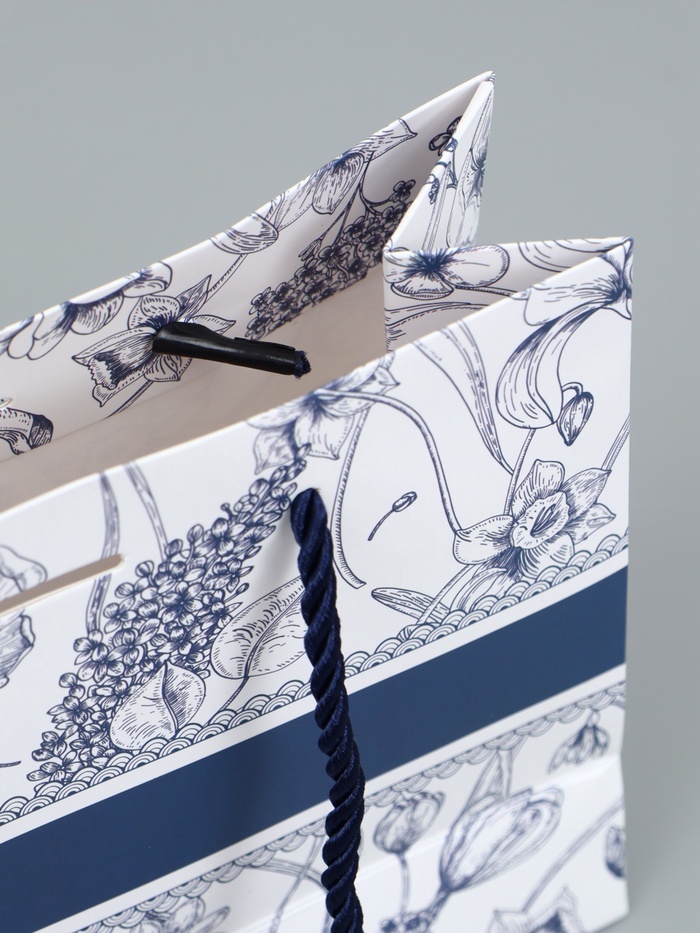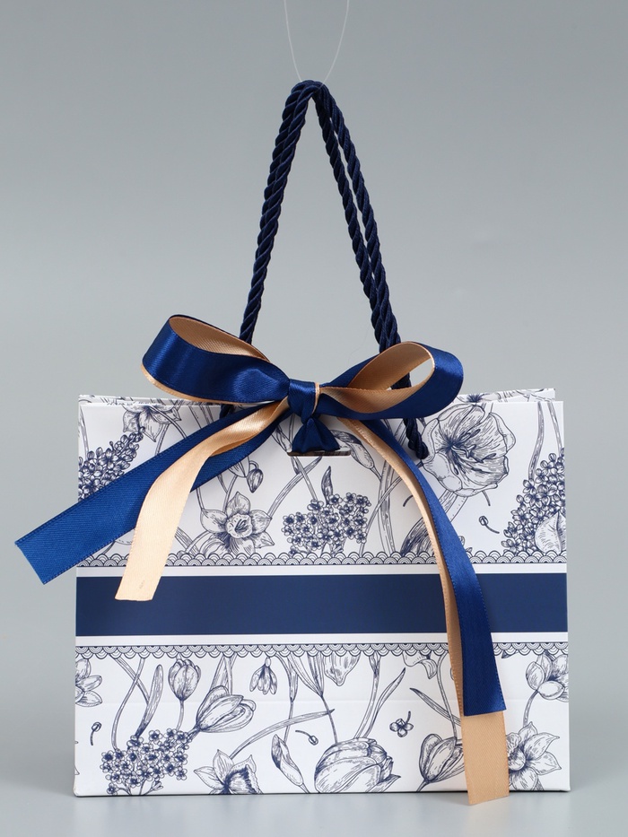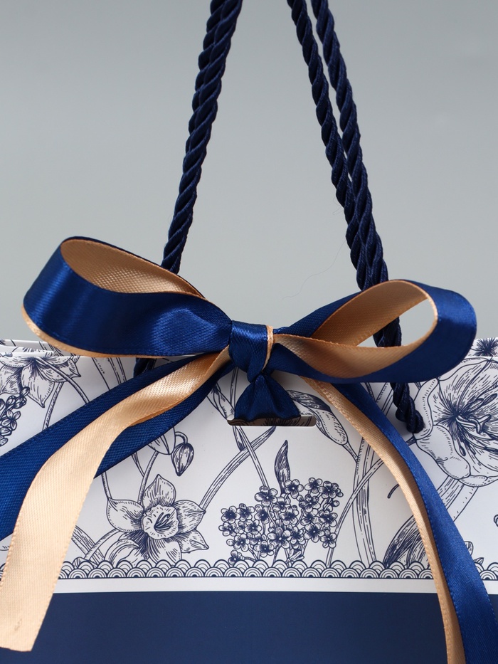 - Шнуровые ручки и бант в комплекте: Ручки-шнуры выглядят элегантно и удобно лежат в руке. В комплекте есть декоративный бант — пакет уже полностью готов к вручению, нужно только положить подарок.