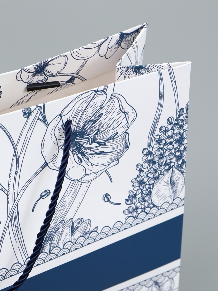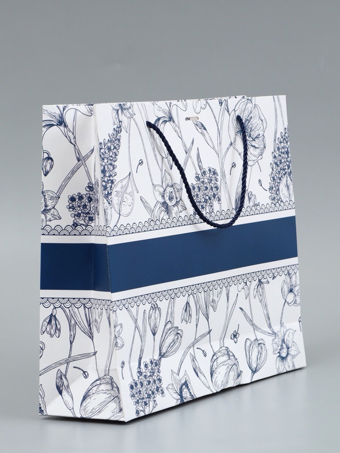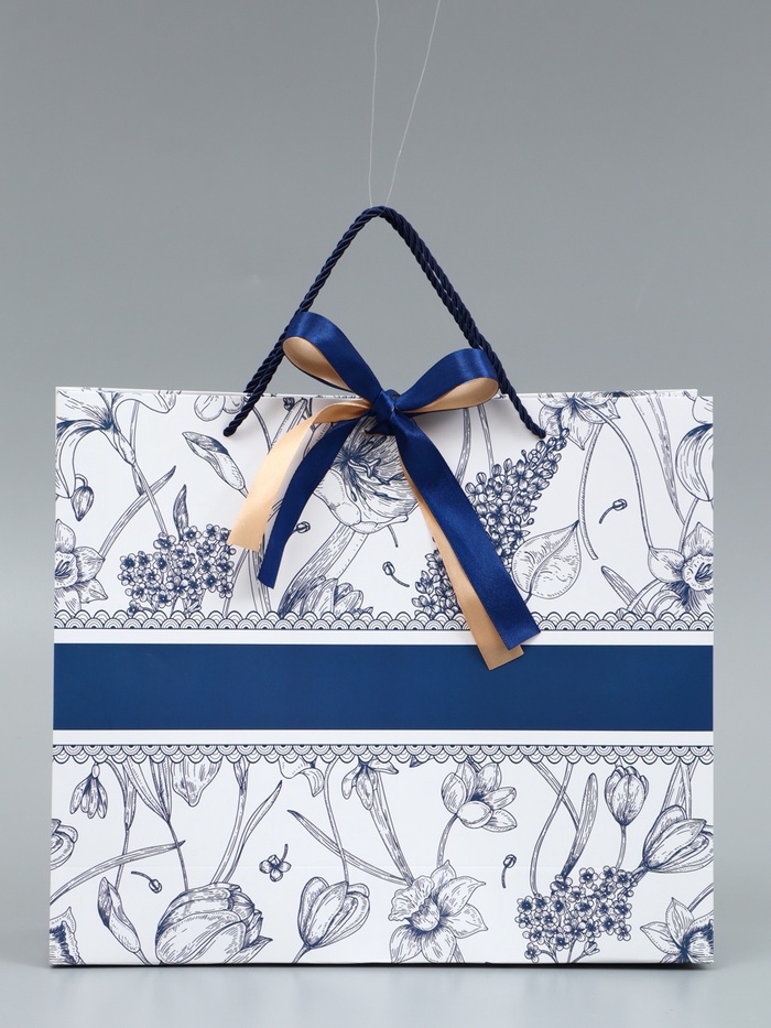 Ламинированный подарочный пакет с бантом и шнуровыми ручками (35×30×10 см, плотность 190 г/м²) — это вместительная упаковка премиум-класса. Бело-синий мраморный узор с цветочным принтом и глянцевое покрытие создают эффект дорогого презента.