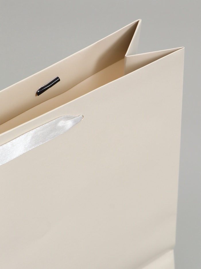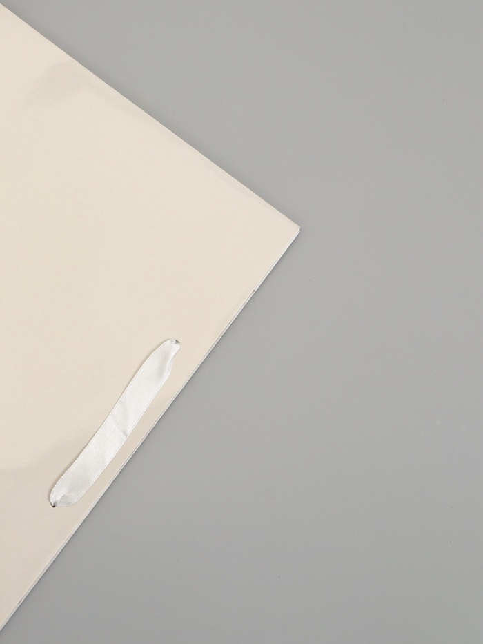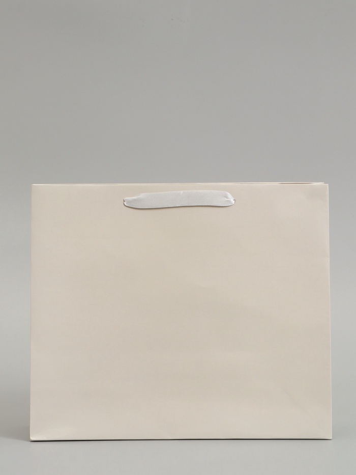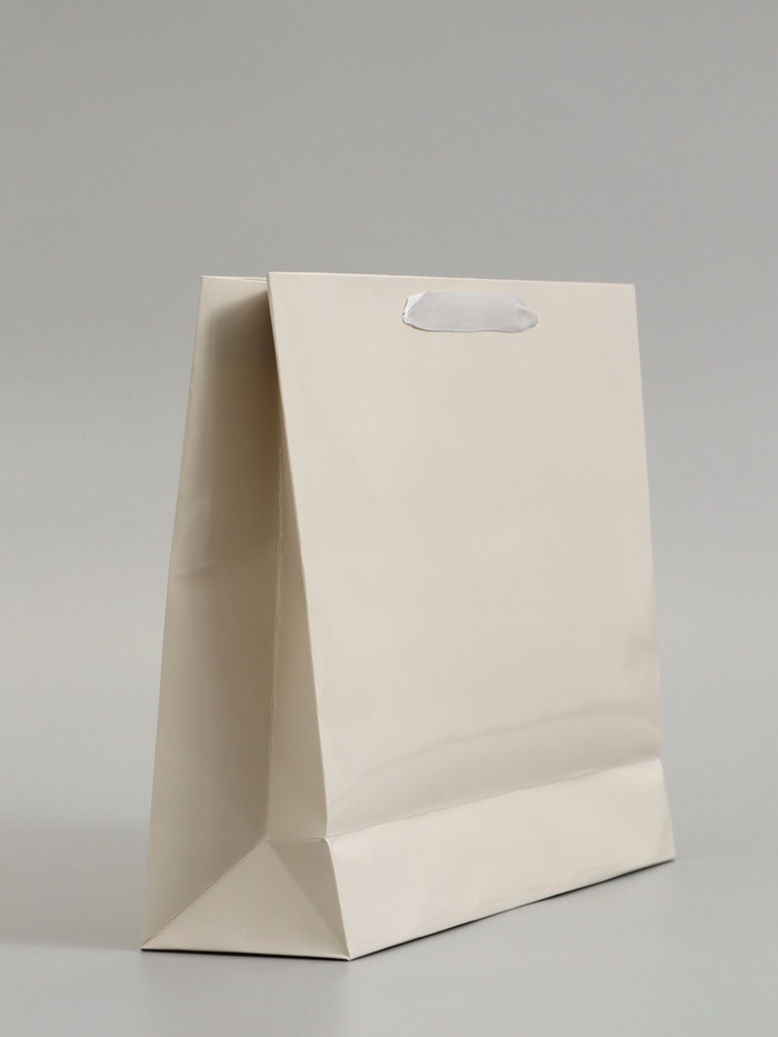 Молочный ламинированный подарочный пакет (30×25.5×9 см) – горизонтальный пакет среднего размера с тёплым бежевым оттенком. Ламинация придаёт бумаге глянцевый блеск и защищает от влаги.