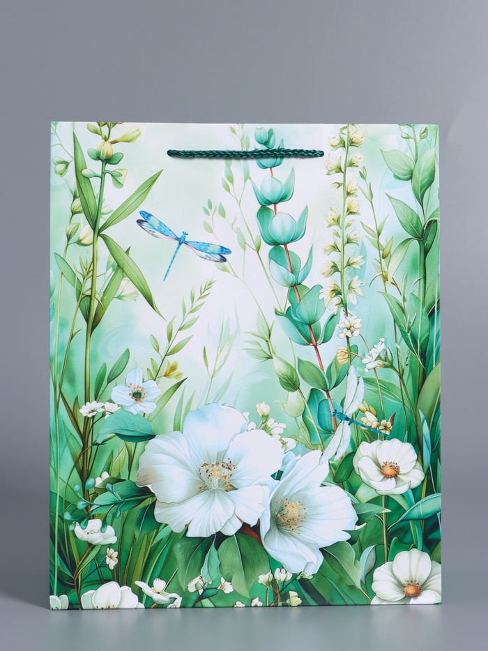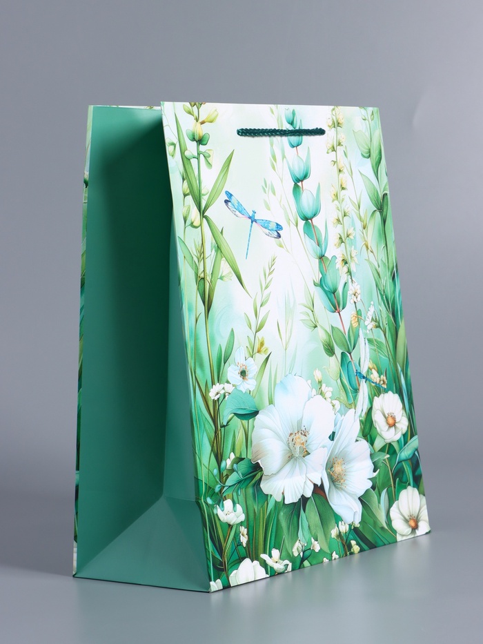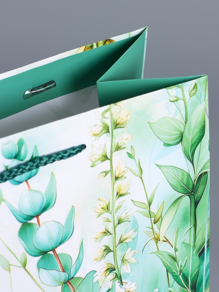 - Дизайн, дарящий ощущение свежести: Насыщенный зелёный фон с нежными растительными элементами ассоциируется с природой, ростом и спокойствием. Такой пакет подходит для подарка на 8 Марта, 14 Февраля или для создания особого настроения без привязки к дате.