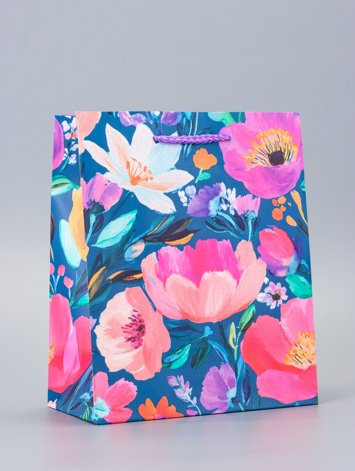 Подарочный пакет «Магия цветов» — это ламинированная упаковка среднего размера с глубоким синим фоном и изысканным ботаническим принтом. Он создает ощущение таинственности и стиля, превращая обычный подарок в значимый жест внимания.