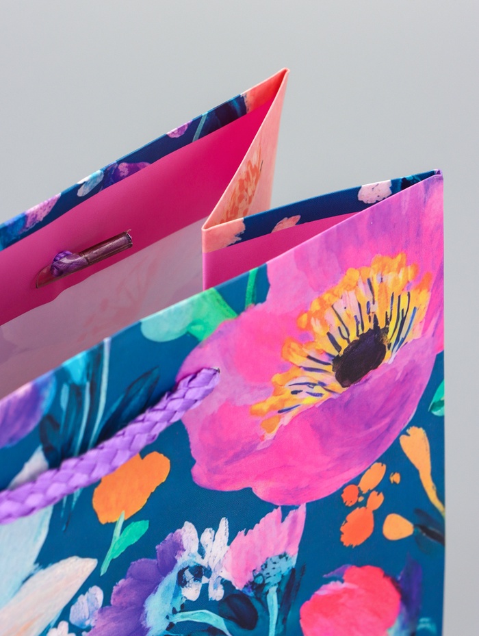 - Стойкость к повреждениям: Плотная бумага 180 г/м² с ламинацией выдерживает нагрузку, предохраняет рисунок от выцветания и мелких царапин. Пакет сохраняет презентабельный вид от момента упаковки до вручения.