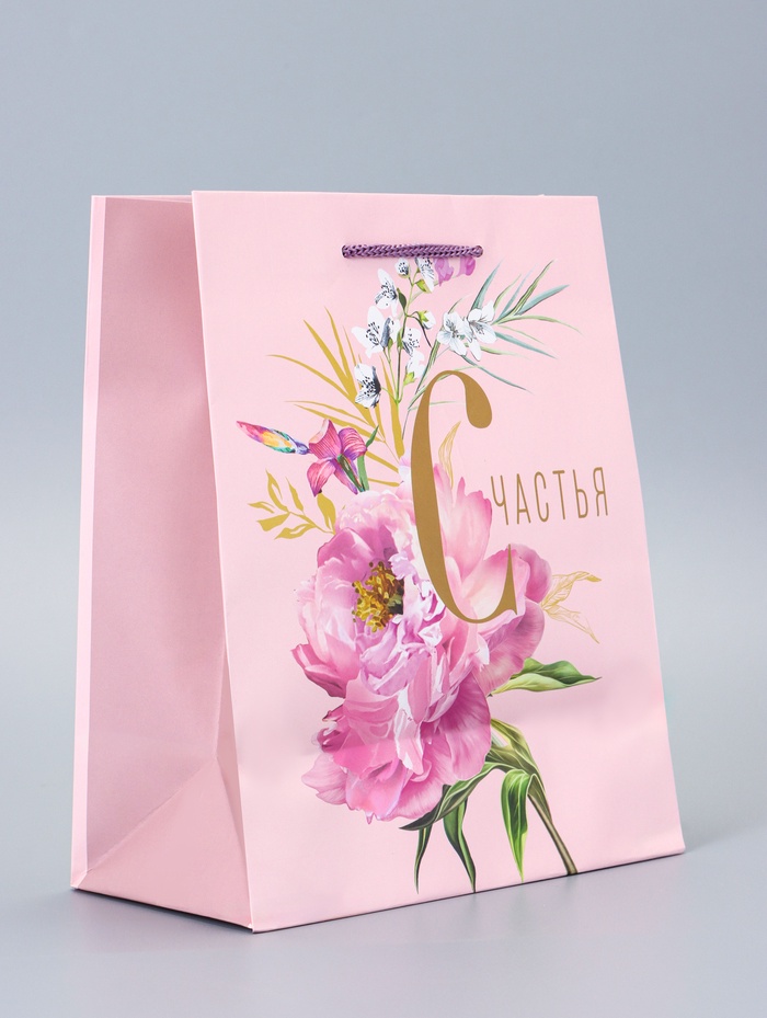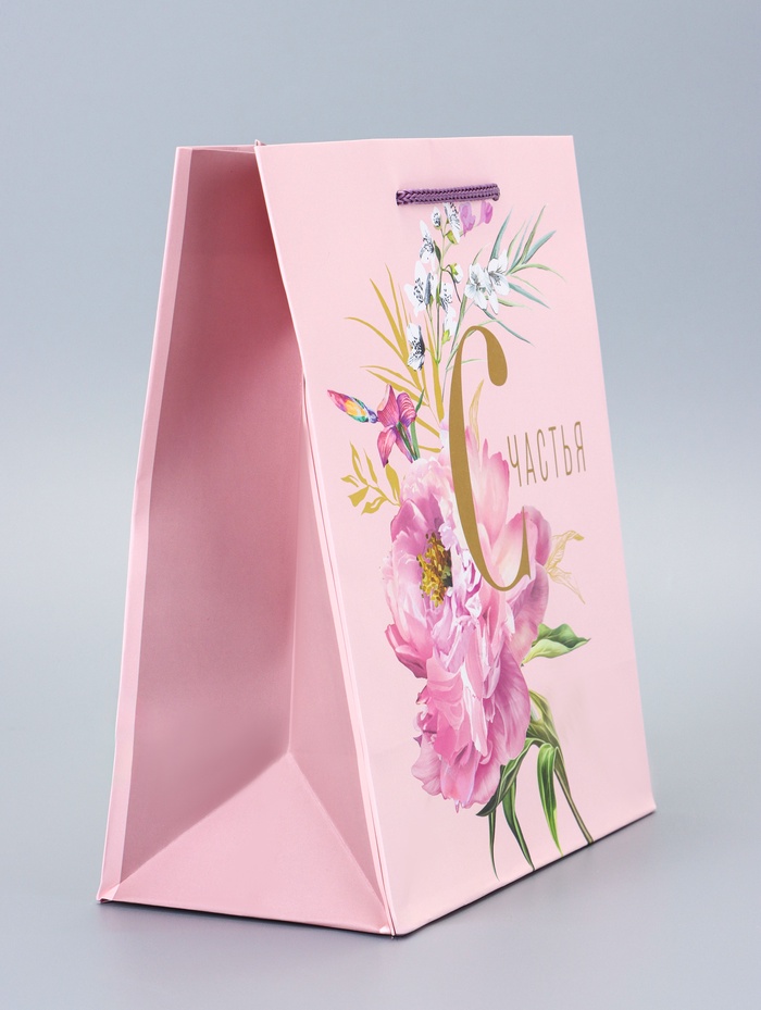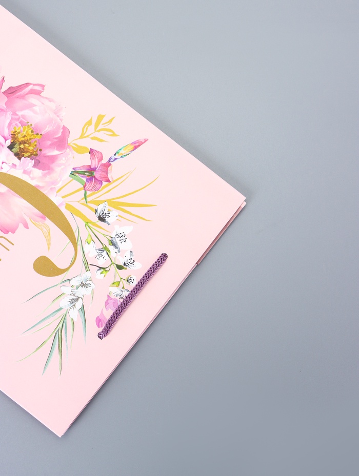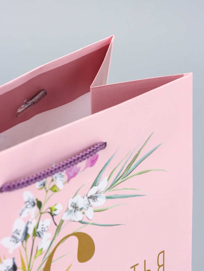 - Нежный женственный дизайн: Розовый фон с цветочными мотивами создает ощущение тепла и заботы. Этот пакет станет гармоничным обрамлением для подарка женщине или девушке.