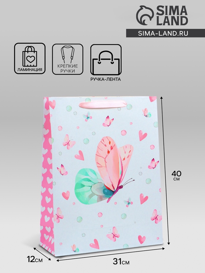 Пакет подарочный ламинированный вертикальный «Бабочка», L 31×40×12 см