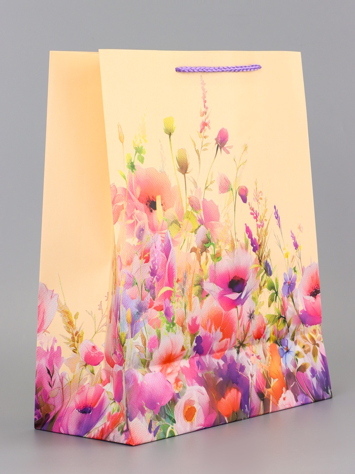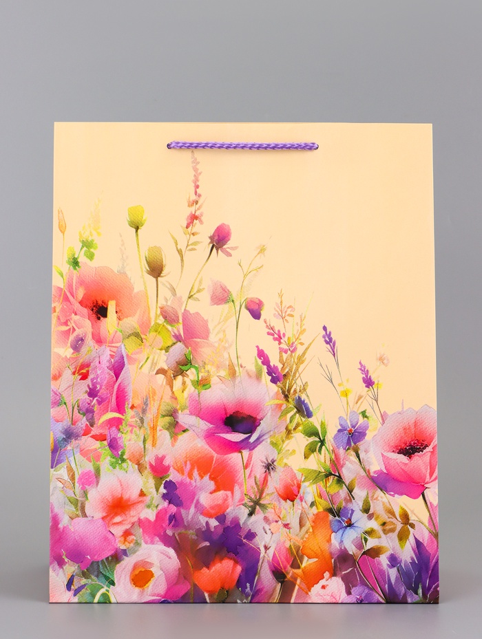 Пейзаж в подарок. Большой подарочный пакет с сюжетом «Прогулка по лугу» — это целая история на упаковке. Дизайн переносит в летний день, наполненный цветами и светом.