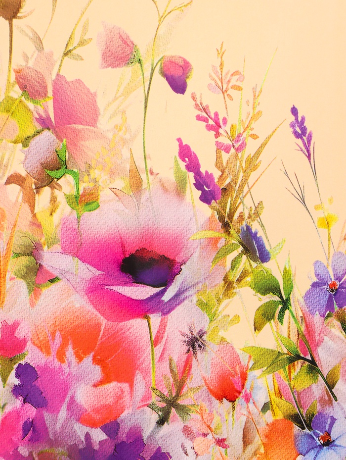 - Развёрнутый сюжет с природным ландшафтом: Рисунок изображает цветущий луг, деревья и траву, создавая ощущение простора и безмятежности. Это не просто узор, а полноценная картина.