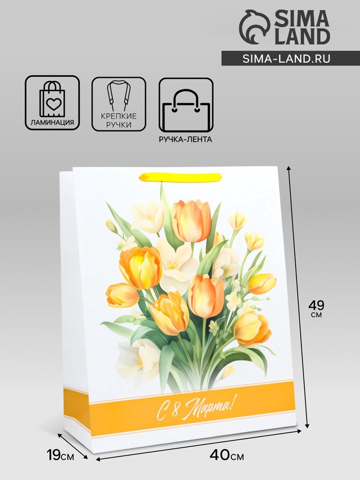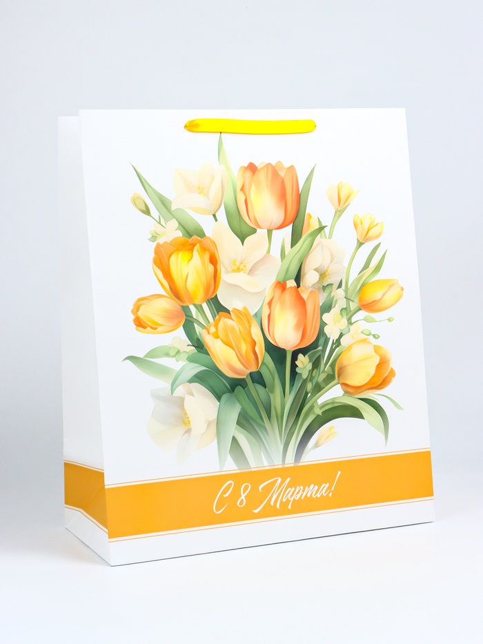 Этот яркий и праздничный подарочный пакет станет идеальным выбором для поздравления девушки на 8 Марта! Вертикальный формат пакета позволяет удобно разместить различные виды подарков, такие как косметика, украшения или книги.