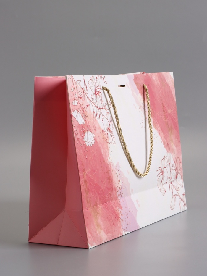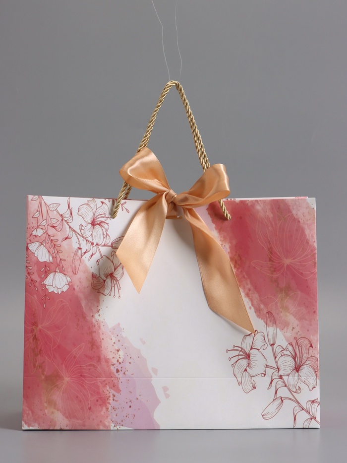 Пакет подарочный "Мрамор" , розовый , с бантиком , 32 х 25 х 11 см