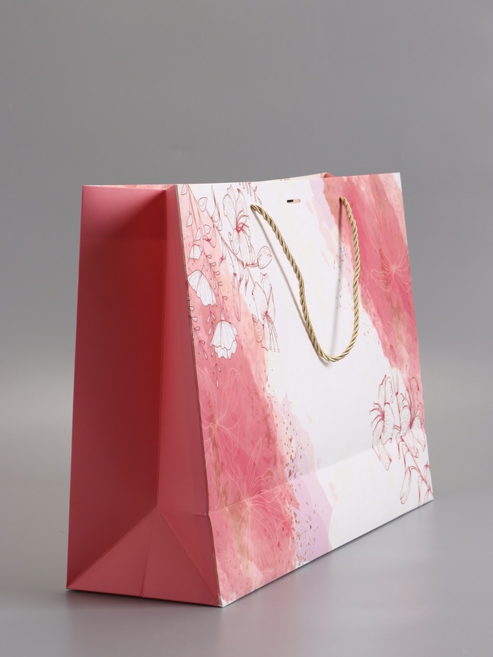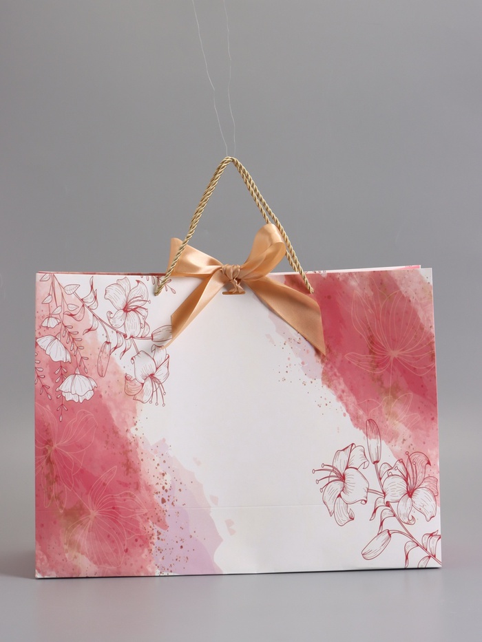 Пакет подарочный "Мрамор" , розовый , с бантиком , 43 х 32 х 14 см