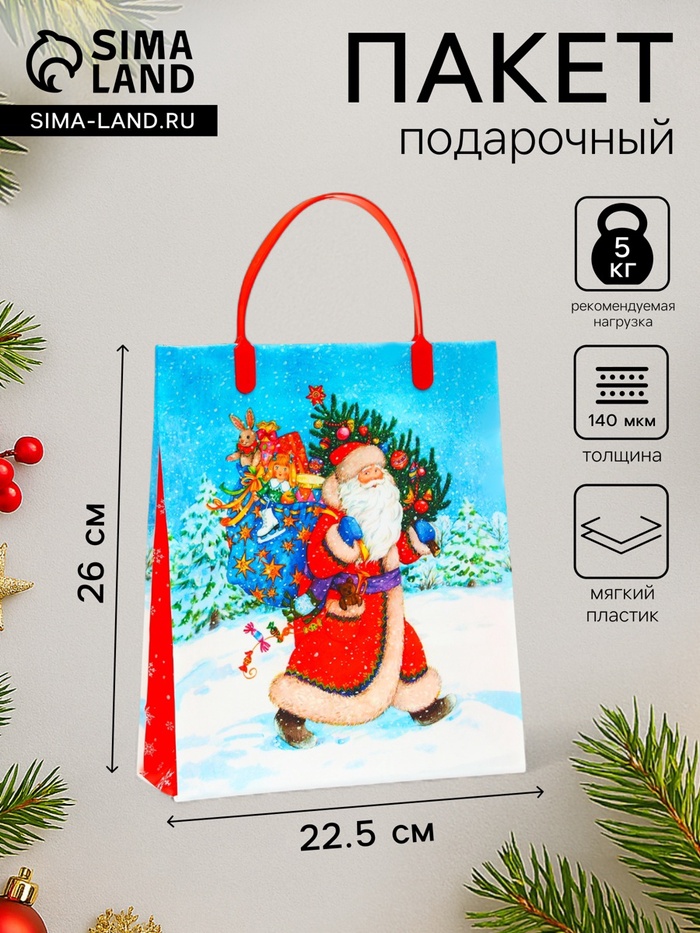 Этот яркий и прочный подарочный пакет станет идеальным решением для упаковки новогодних подарков. Выполненный из мягкого пластика толщиной 140 мкм, он обладает высокой прочностью и выдерживает значительные нагрузки, что делает его универсальным для самых разных подарков — от игрушек и сладостей до книг и косметики.