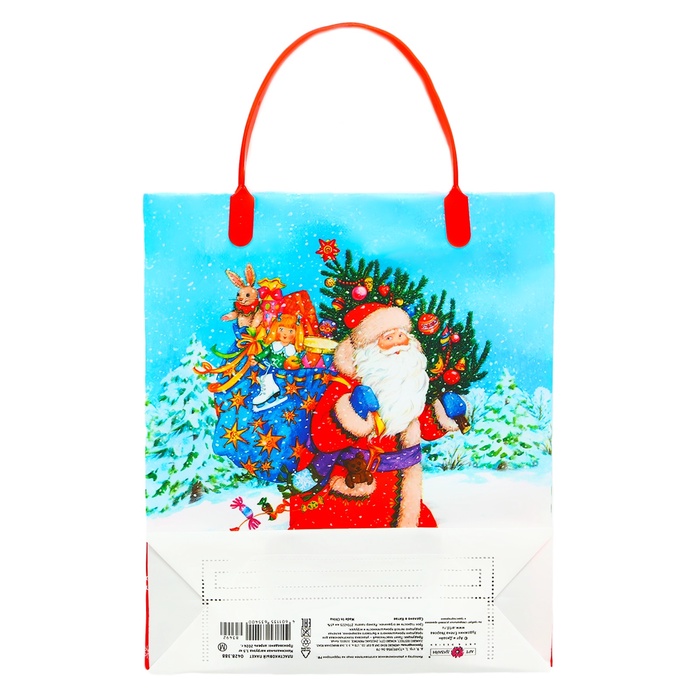 Праздничный дизайн с яркими новогодними элементами, такими как снежинки, ёлочные игрушки и зимние пейзажи, создаст особую атмосферу ожидания чуда и уюта. Удобные ручки-сумка обеспечивают комфорт при переноске, а вместительный размер позволяет легко упаковать и транспортировать даже крупные подарки.