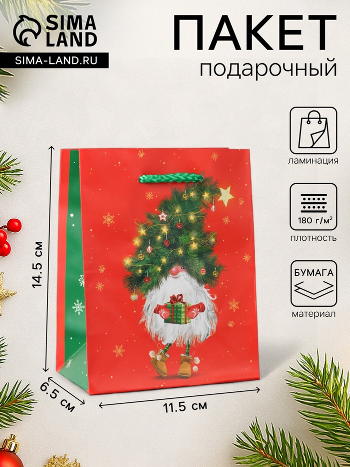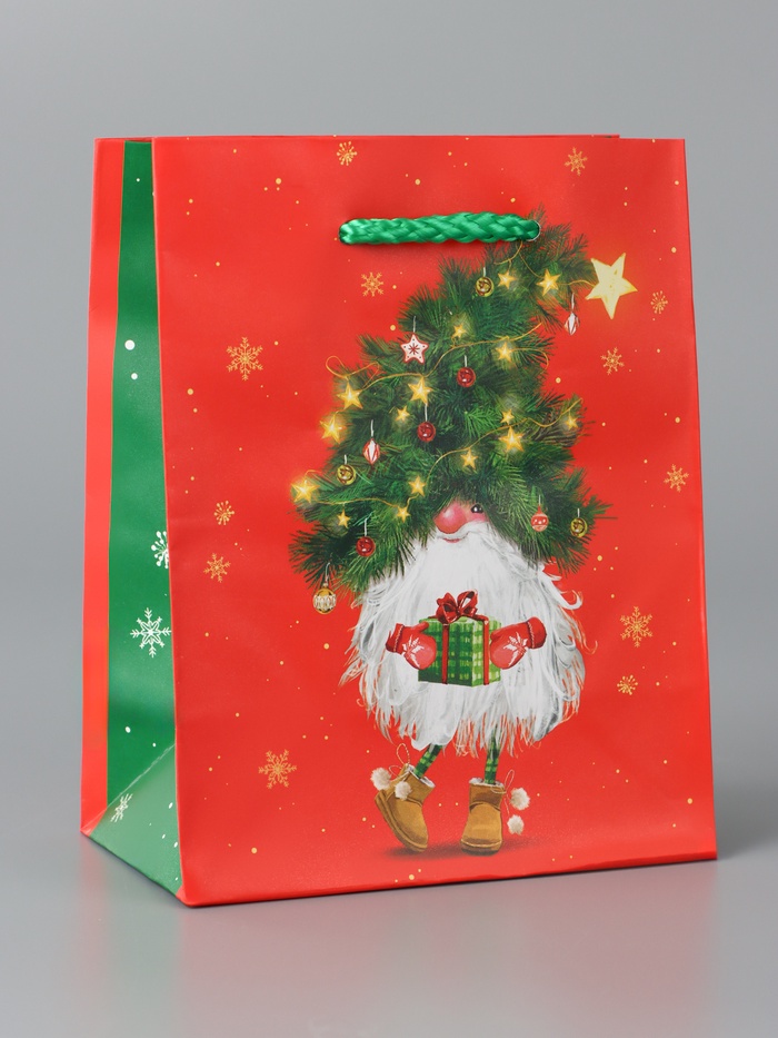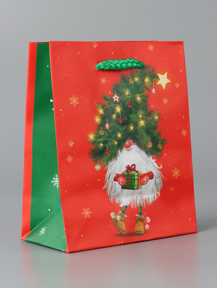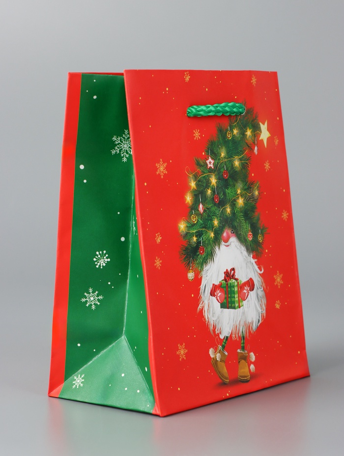 Новогодний подарочный пакет с ярким, красочным рисунком создаст праздничное настроение.