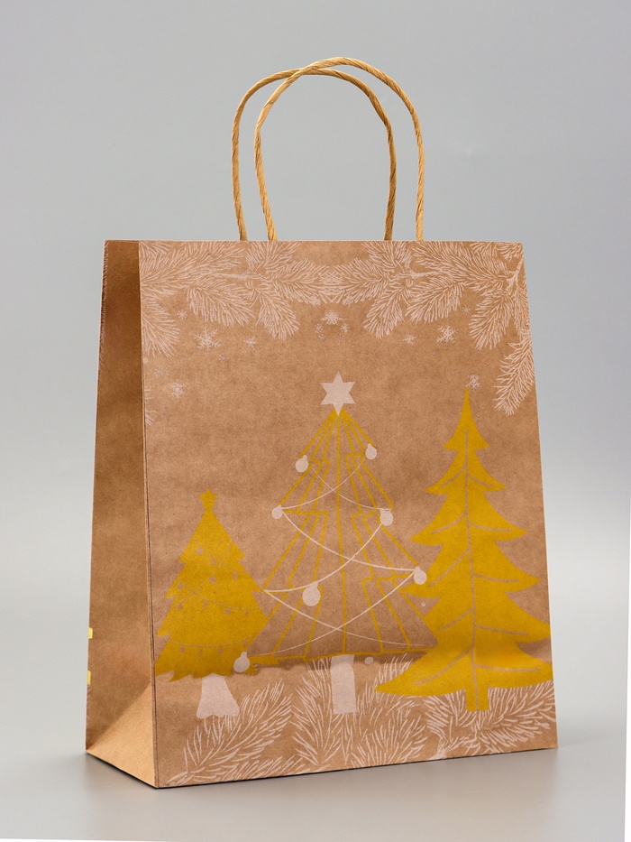 Пакет подарочный новогодний, крафт с золотым тиснением, круглая ручка, «Рождественский лес» 33×25×12 см, 120 г