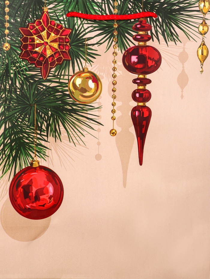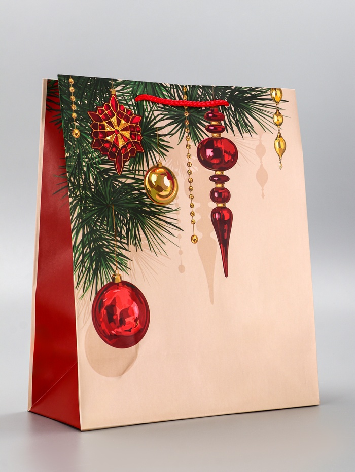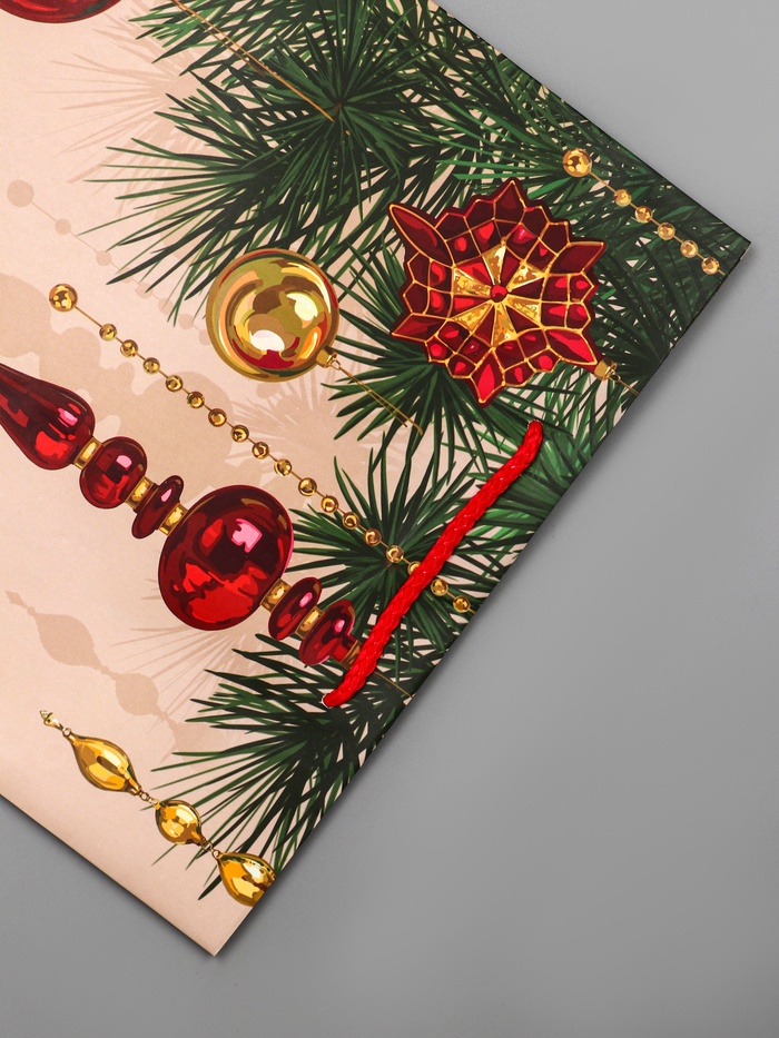 - Классический дизайн: Теплый бежевый фон с изображением новогодних шаров создает атмосферу традиционного праздника. Универсальное оформление подходит для подарков всем членам семьи.
