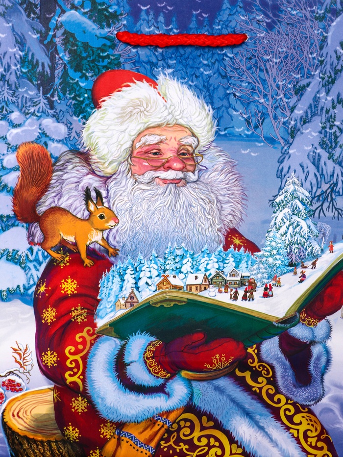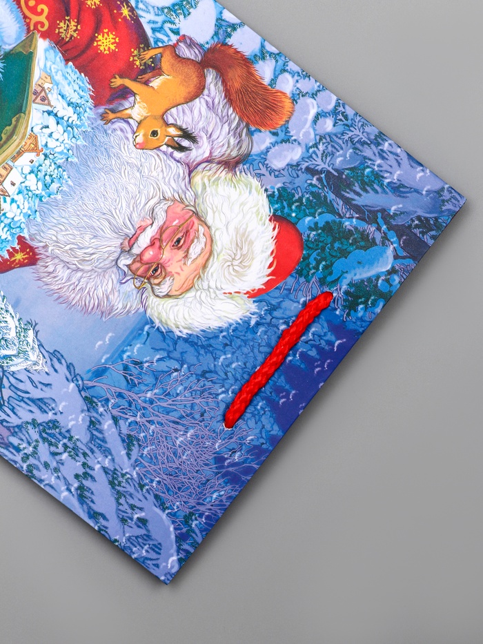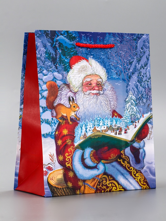 - Универсальный дизайн: Яркое изображение Деда Мороза на красном или синем фоне подходит для подарка и девочке, и мальчику. Классическая новогодняя тематика делает пакет уместным в любой ситуации.