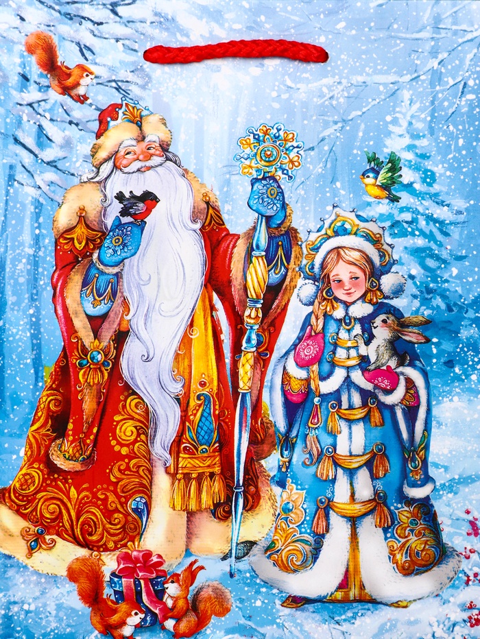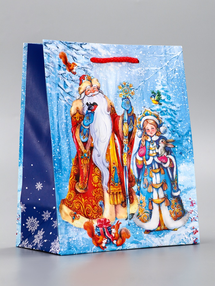 Главные символы Нового года в ваших руках! Новогодний подарочный пакет «В гостях у сказки» — это упаковка с традиционными персонажами праздника. Нежный голубой фон с изображением Деда Мороза и Снегурочки создает атмосферу волшебства и детского ожидания чуда.