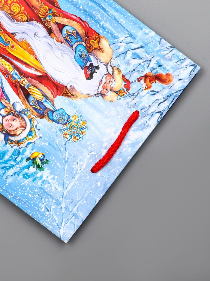 - Удобство для подарков детям: Мягкие шнуры-ручки комфортно лежат в детской руке. Это делает пакет практичным выбором для новогодних утренников и семейных праздников.
