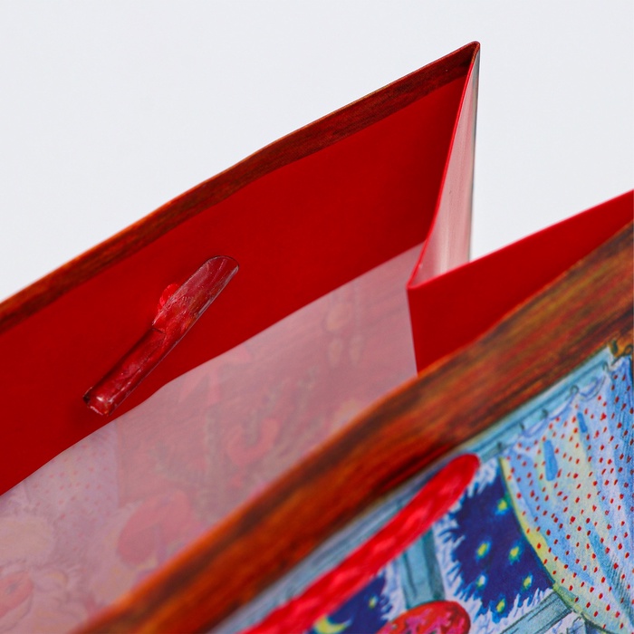 Пакет имеет плотную структуру и приятную на ощупь поверхность, что делает его удобным в использовании. Он украшен яркими новогодними узорами и изображениями, которые создают атмосферу праздника и волшебства.