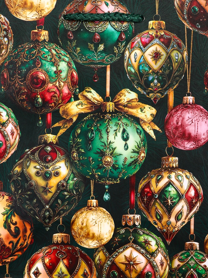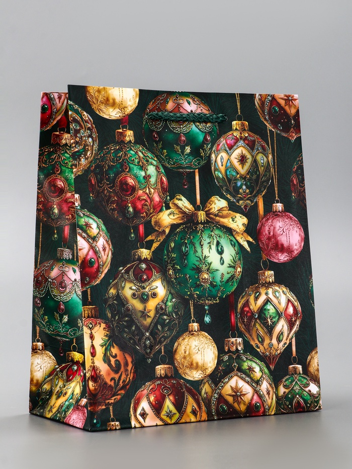 Новогоднее настроение в каждой детали! Подарочный пакет «Игрушки Новогодние» — это яркая упаковка, которая сама становится частью праздника. Классический зелёный фон с узором из ёлочных шаров создаёт ощущение волшебства и зимней сказки.