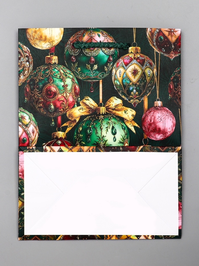 - Универсальная тематика: Классическое новогоднее оформление с ёлочными шарами подходит для подарков и девочкам, и мальчикам. Зелёный цвет ассоциируется с хвойными ветками и зимним праздником.