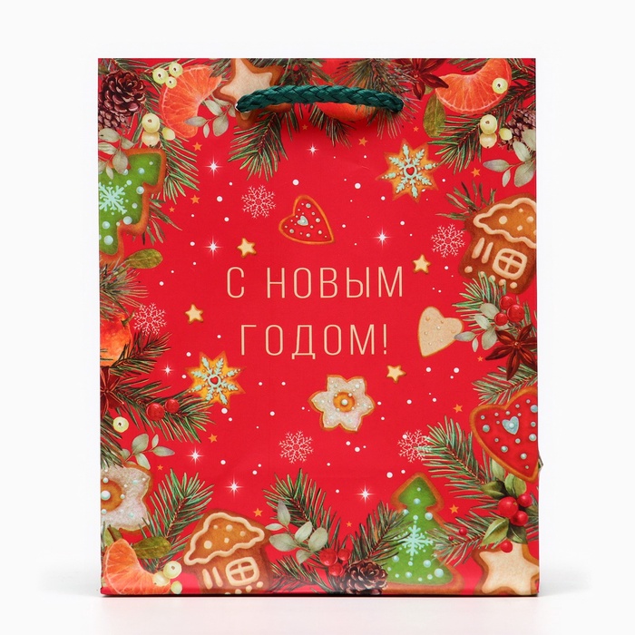Новогодний подарочный пакет, выполненный из высококачественного материала с плотностью 210 г/м². Этот пакет идеально подходит для упаковки подарков на Новый год и создания праздничной атмосферы.