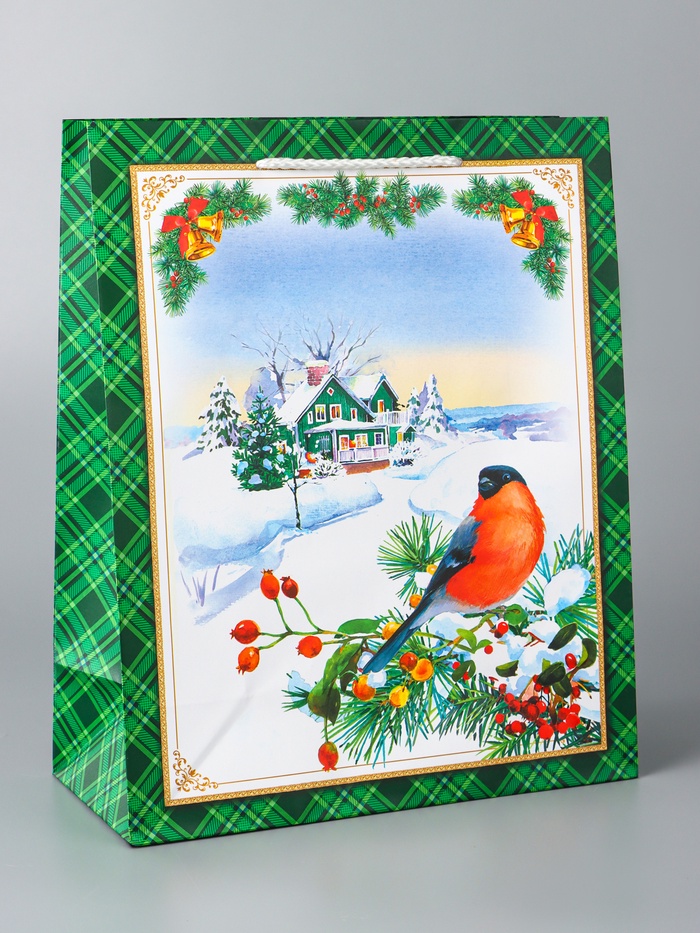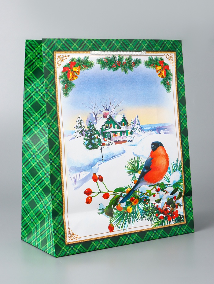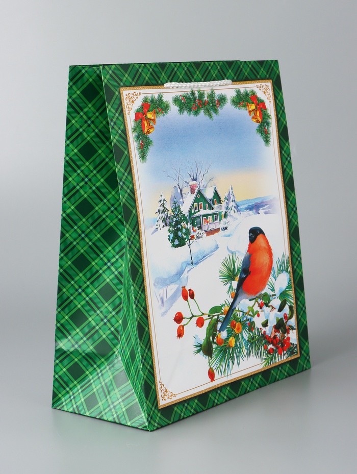Новогодний подарочный пакет с ярким, красочным рисунком создаст праздничное настроение.
