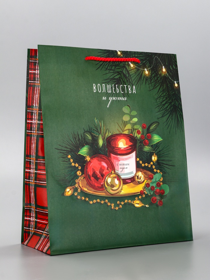 Создайте атмосферу теплого зимнего праздника! Большой новогодний подарочный пакет «Магия уюта» — это просторная упаковка с тематическими надписями на сочном зеленом фоне. Ламинированная поверхность и праздничный дизайн создают ощущение домашнего тепла и волшебства.