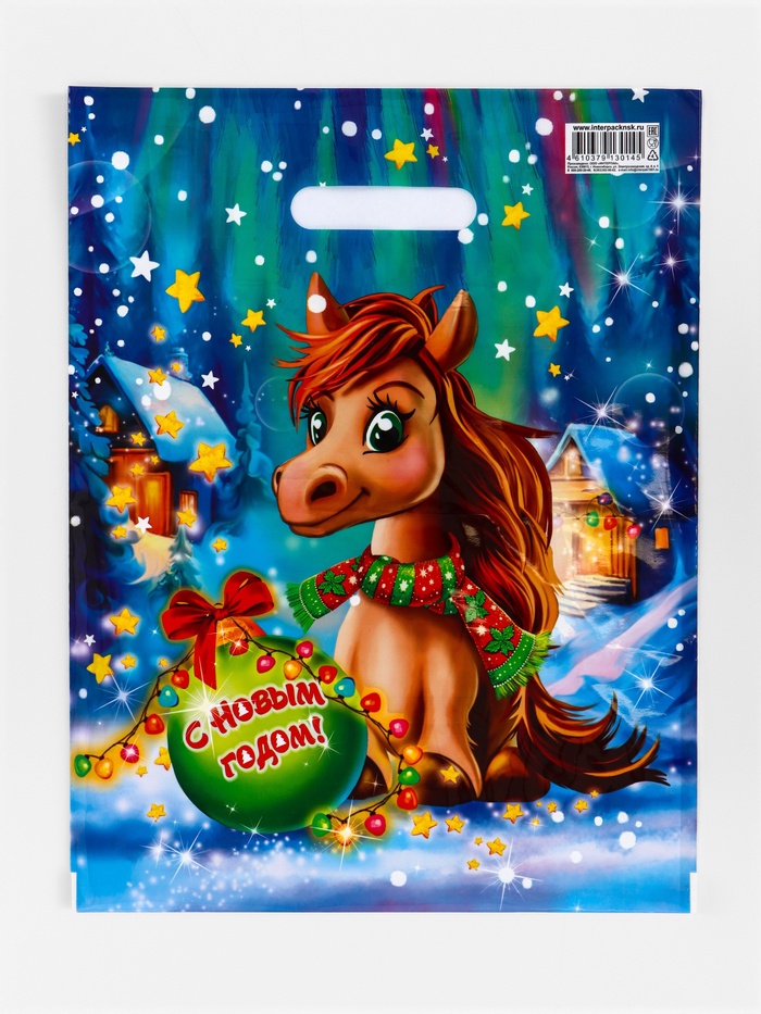 Новогоднее настроение в каждой детали! Праздничный пакет с лошадью — символом 2026 года — стильная упаковка для подарков в морозных синих тонах. Удобные вырубные ручки и увеличенный формат делают его практичным выбором для новогодних сюрпризов.