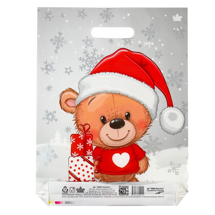Полиэтиленовый новогодний пакет с вырубной ручкой - это удобное и практичное решение для переноски покупок, подарков или других предметов.